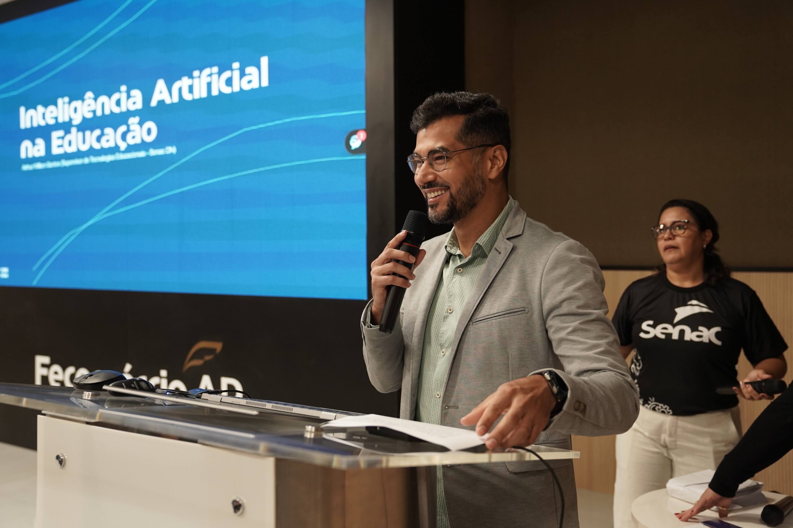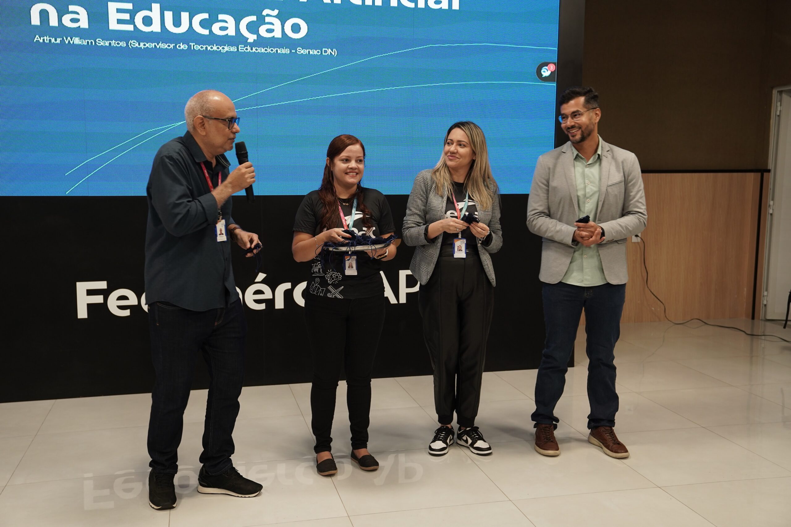 O supervisor de Tecnologias Educacionais do Departamento Nacional do Senac, Arthur William Santos, e o professor do Instituto Federal do Amapá (IFAP), Klenilmar Lopes, apresentaram possibilidades de uso da IA na Educação para cerca de 80 docentes e técnicos nos seguintes eixos: Engenharia de Prompt, Agentes de IA, Criação de ODAs e Desenvolvimento de Projetos de Inteligência Artificial.
